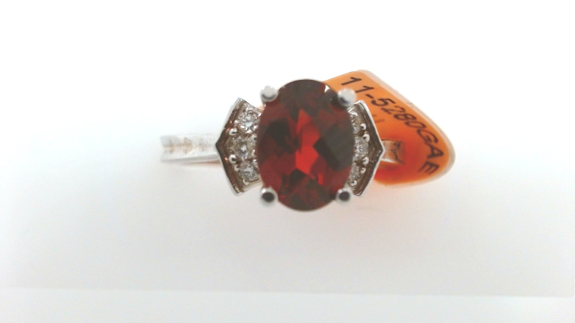Lady's White 10 Karat Fashion Ring With One = 1.00Ct Oval Garnet And 6 = 0.10Tw Round Diamonds