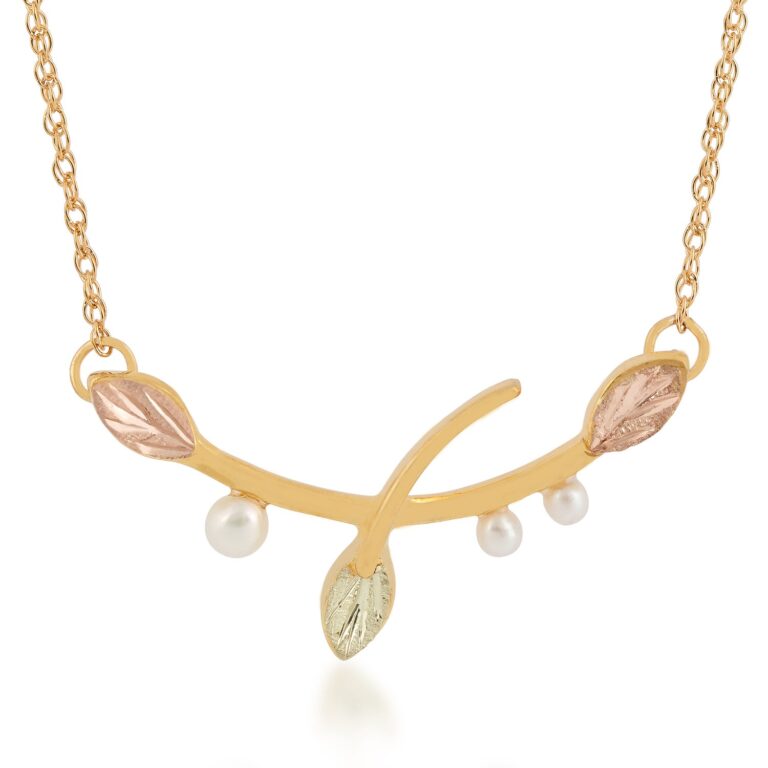Black Hills Gold 10K gold contemporary vine with 2mm & 3mm freshwater pearls accented with contemporary 12K rose & green gold leaves. Complimentary gold filled chain included.