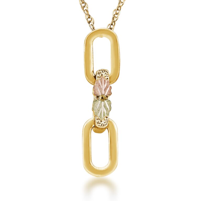 Black Hills Gold paperclip dangle pendant with 12K pink & green leaf trim. Complimentary 18″ gold filled chain included.